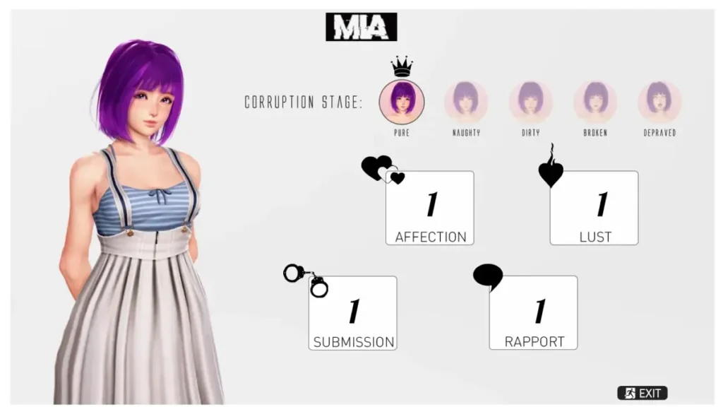 | Shame | Represents embarrassment or loss of dignity. For some characters, increasing this is a positive goal; for others, it’s a failure state. Drives specific kink-based storylines. |